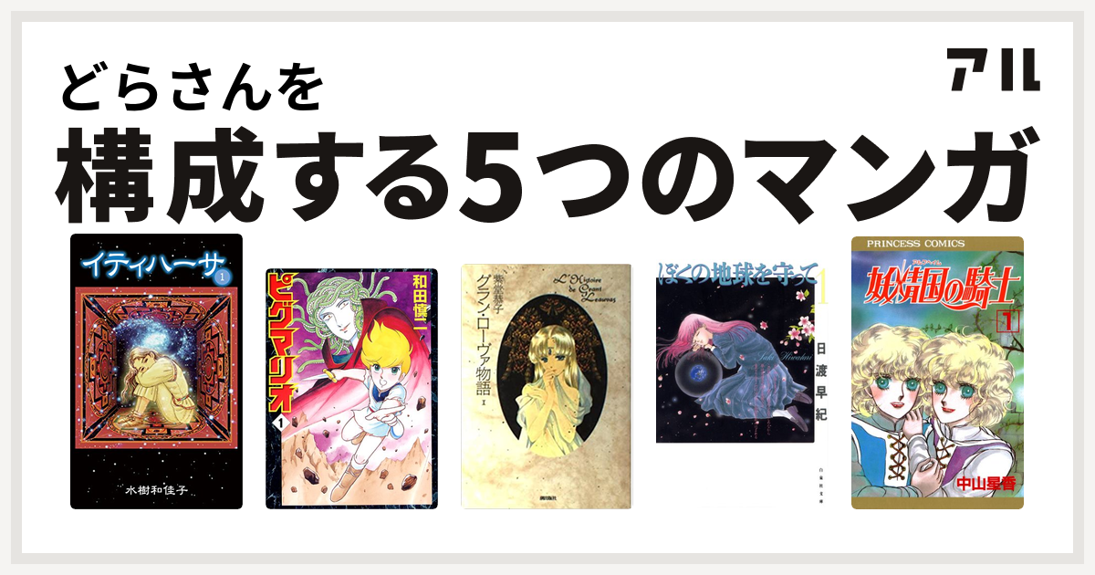 どらさんを構成するマンガはイティハーサ ピグマリオ グラン ローヴァ物語 ぼくの地球を守って 妖精国の騎士 アルフヘイムの騎士 私を構成する5つのマンガ アル